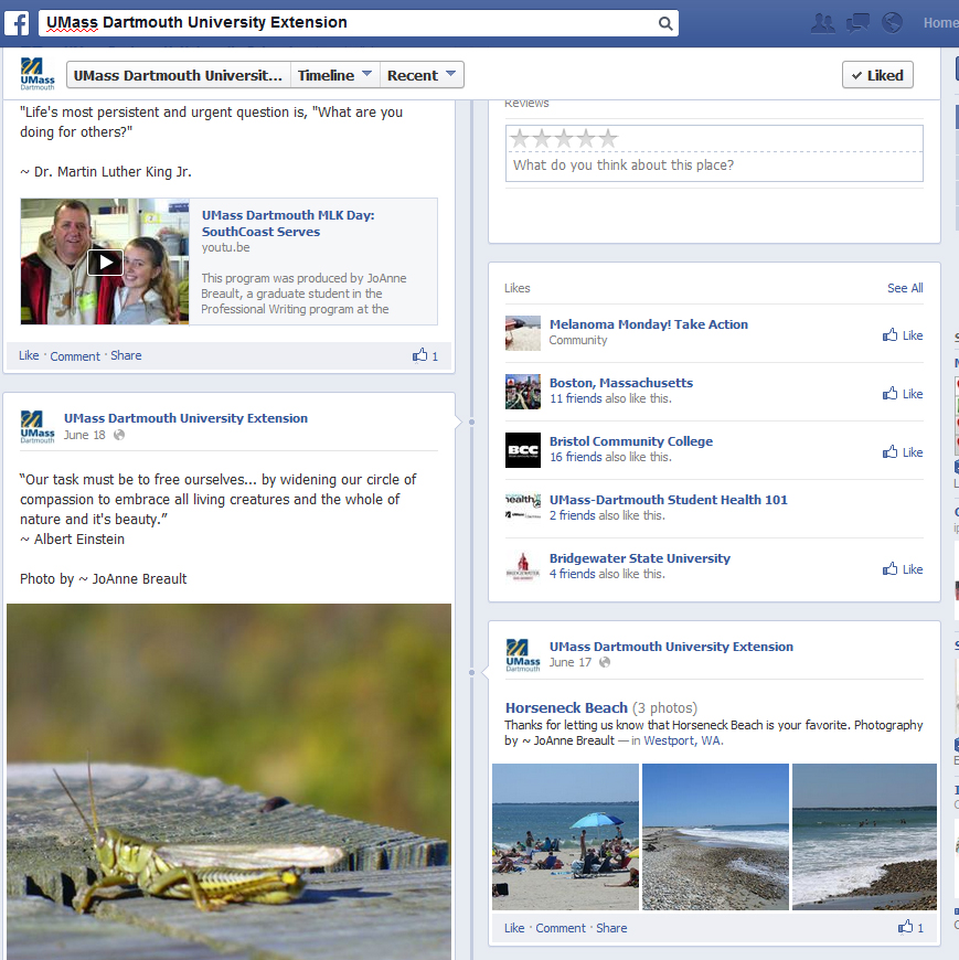 This is a sample of some of my social media work for University Extension at UMass Dartmouth. I produced a video about UMass Dartmouth’s volunteer work on Martin Luther King Day. This video was broadcast on You Tube and Vimeo. The video increased UMass Datmouth’s rankings on the internet and branded the university as an institution that promotes volunteer work. I also shot the photos in the other sections and engaged the viewers with a conversation about the local beaches.